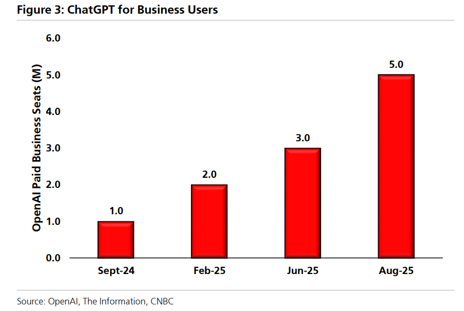 在用户结构方面,OpenAI最近披露其付费企业用户数量已突破500万,较6月的300万增长60%。如果总付费用户数为3500万的估算准确,企业用户约占付费用户基数的15%,不过,行业观察人士认为开发者日不太可能重点关注企业级新功能。